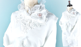 なるべく他人にはお見せしたくない首筋・胸元・手首には柔らかいレース、フリルなどを幾重にも重ね美しく整えました。